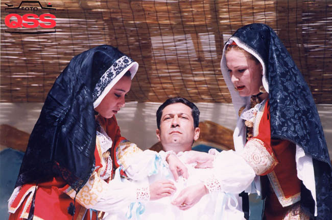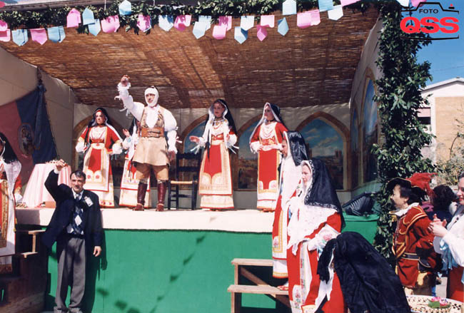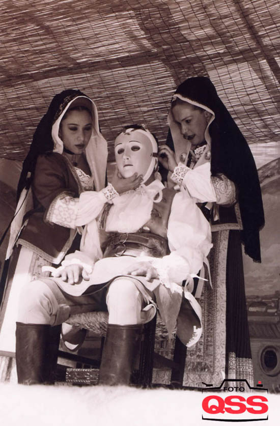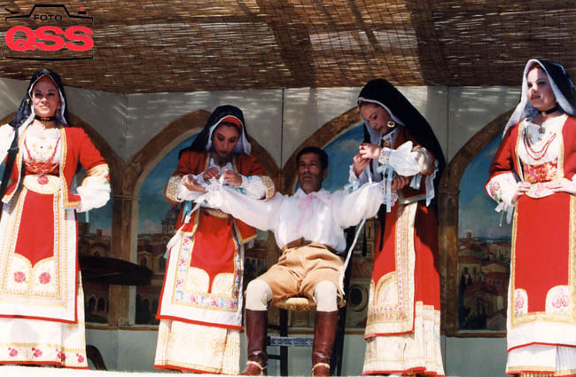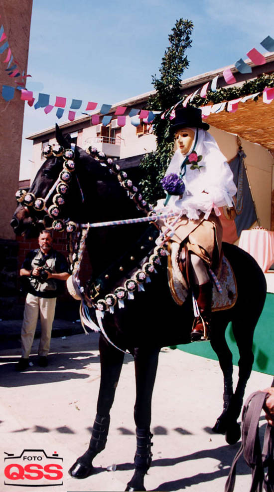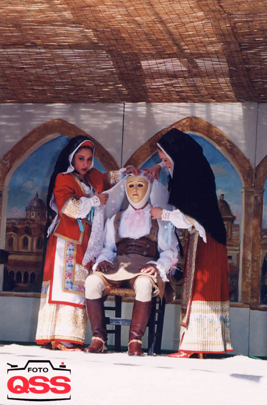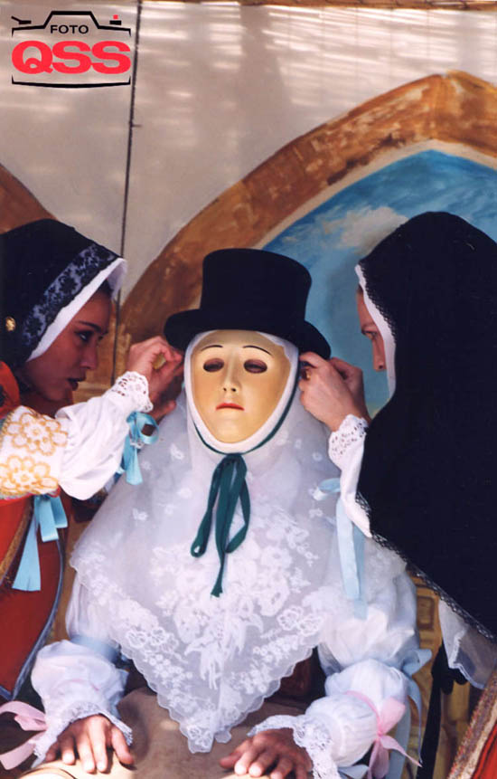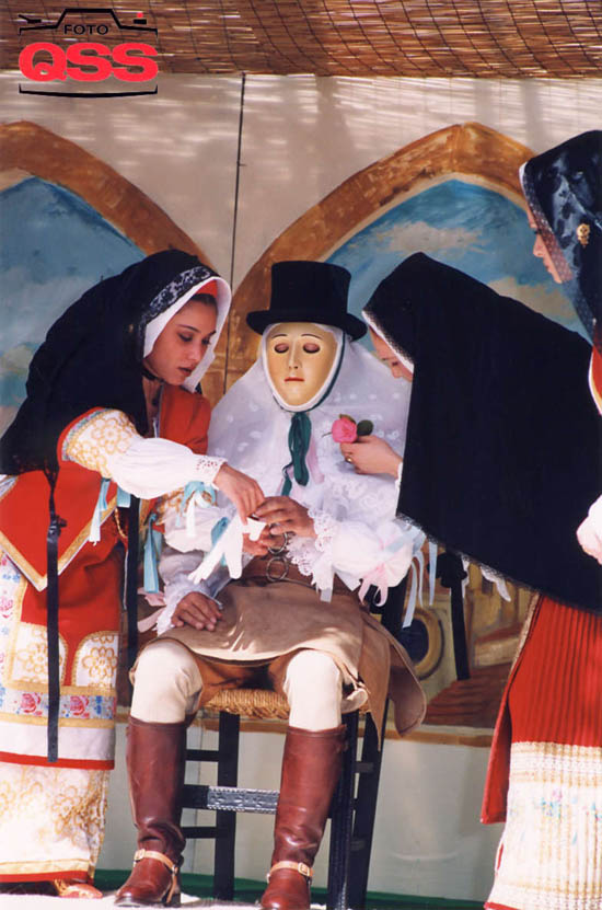 Le varie fasi che precedono il torneo, cosi complesse e via via cosi marcate dai momenti rituali emozionanti, indicano una consapevolezza popolare generale che ha lo scopo di incoraggiare l'uomo comune, l'uomo prescelto a battersi in un duello simbolico e sacrale, ma sempre pericoloso e pieno di incognite. Ed il suo è un gesto di sacrificio che ha inizio proprio quando indossa la maschera e sfuma il suo autentico volto di uomo comune, e la sua gente ne perde momentaneamente anche il ricordo: è un rito di vestizione, ma soprattutto di purificazione nel più sacrale e commovente silenzio interrotto dal poderoso rullare dei tamburi che fanno fremere gli astanti, preannunziando il momento in cui l'uomo assume sembianze irreali ed il suo sguardo diventa d'incanto tenebroso, profondo e lontano, come comandato da un misterioso richiamo divino, con la sua straordinaria forza magica apotropaica di penetrare nelle tenebre del mistero per scacciare dal contado gli spiriti del male. E in questo supremo compito il Componedor è assistito dai suoi aiutanti: coraggiosi, baldi e intransigenti, in groppa a cavalli dalle gualdrappe variopinte, poi seguono i drappelli e tutto l'esercito di cavalieri, fedeli alla consegna, che vanno verso l'incognito. Ecco perché questa maschera in un certo senso è di Tharros. Essa è sacra e ressuna mano può sfiorarla, se non quella delle fanciulle che sovraintendono sull'altare al rito purificatore, proprio come le piccole Kore dell'acropoli di Tharros, ma anche come quelle degli altari di Pergamo, di Olimpia, di Delfi, di Atene e di Locri. E questa maschera diventa armatura nel momento in cui cela il volto del guerriero: cosi saldata, fissata ai turbanti per aderire al volto diventa elemento di sofferenza fisica e quindi di sacrificio per il sacerdote-guerriero che si trasforma: ora non ha più un volto comune, è un personaggio silenzioso, muto, e si esprime in un linguaggio di gesti misurati e pacati, solenni e religiosi. (Giorgio Farris, op.cit.) |